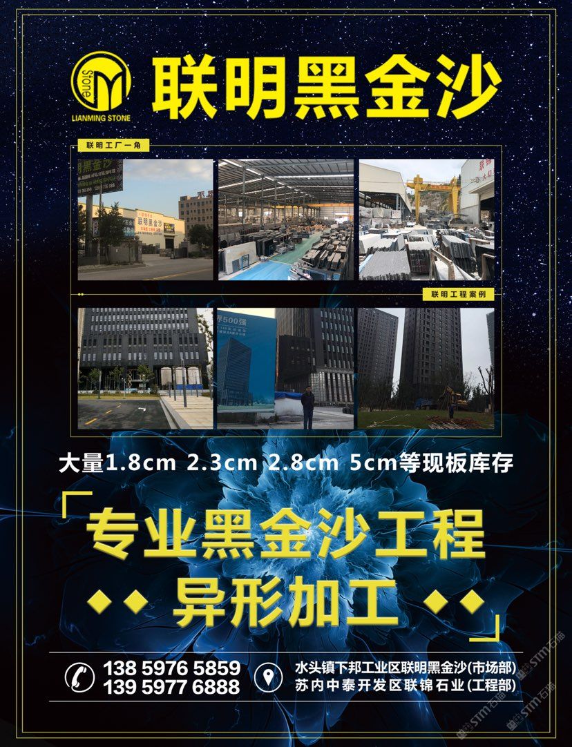 【聯(lián)明?黑金沙】——大工廠的規(guī)模和質(zhì)量,小廠的價格。兩工廠共占地35左右畝地,一廠為市場部位于水頭鎮(zhèn)下邦工業(yè)區(qū),二廠為工程運(yùn)營中心位于石井中泰集控區(qū),是一家集礦山、生產(chǎn)、加工為一體化的綜合性專業(yè)化石材工廠,有著十幾年的黑金沙經(jīng)驗,公司主要經(jīng)營黑金沙市場板,工程板,黑金沙異型加工。工程案例有:1、上海楊浦區(qū)149項目中船大廈,黑金沙總用量3萬平方;2、蒼南天和家園共3期,黑金沙總用量5萬平方;