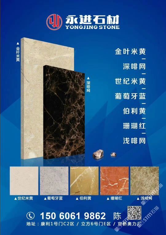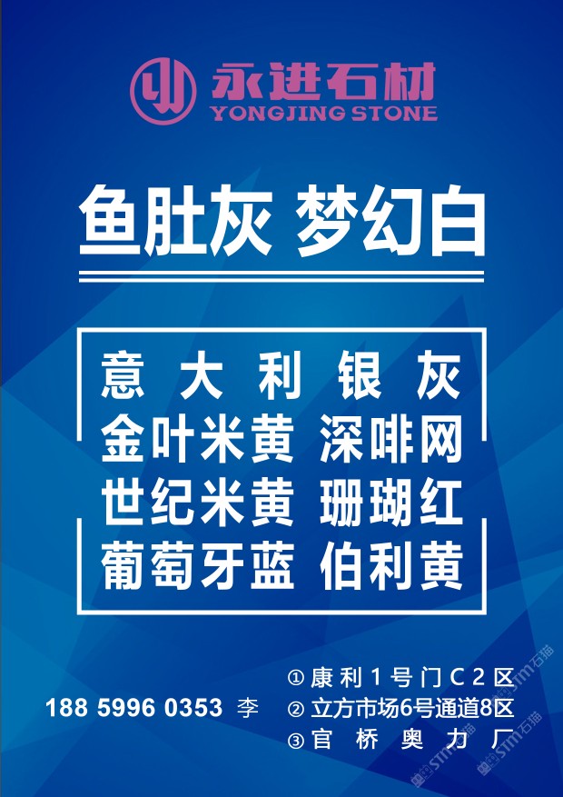 永進(jìn)石材主營:魚肚灰,夢(mèng)幻白,土耳其愛馬仕灰,意大利銀灰,金葉米黃、深啡網(wǎng)、世紀(jì)米黃、珊瑚紅、伯利黃、葡萄牙藍(lán);