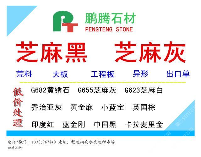 福建省鵬騰石業(yè)有限公司 本廠是一家集礦山開采,生產(chǎn)加工,工程訂單,進(jìn)出口貿(mào)易一體的綜合性企業(yè),距廈門港60KM,漳州火車站30KM,石井碼頭60KM(內(nèi)陸海運(yùn)),交通運(yùn)輸十分方便。 【金華石業(yè)】專門立足于本地豐富的自然資源,擁有成套先進(jìn)的石材設(shè)備,專業(yè)石材加工技術(shù)人員,掌握先進(jìn)的石材加工技術(shù),制定了一整套嚴(yán)格的質(zhì)量控制體系,品質(zhì)管理嚴(yán)格,專業(yè)生產(chǎn)本地石材:G654(芝麻黑),G655(芝麻灰),G682(黃銹石),G603(芝麻白),喬治亞灰,蝦紅、虎皮黃、毛光板,火燒板,踏步板,盲道板,機(jī)刨板,荔枝面,路沿石,蘑菇石,花壇石,花崗巖自然面,建筑用塊石,大型門牌石,墓碑石和橋柱橋欄,圓柱,等各種板材和弧形異型加工。 【鵬騰石業(yè)】專業(yè)加工出口超薄板材和超寬大板,并且在國(guó)內(nèi)外各大石材市場(chǎng)設(shè)有經(jīng)銷部和分公司,專業(yè)批發(fā)各種 大理石大板、花崗巖大板,并承接國(guó)內(nèi)外石材工程。 公司以“質(zhì)量,信譽(yù)”為宗旨,產(chǎn)品質(zhì)量可靠,價(jià)格優(yōu)惠,供貨及時(shí),有能力承接大數(shù)量的定單,是當(dāng)?shù)乜煽抗?yīng)商。竭誠(chéng)歡迎國(guó)內(nèi)外廣大朋友來人來函洽談業(yè)務(wù),互相合作,共同發(fā)展。 電話:0596-8299871 傳真:0596-8267840 手機(jī):13306967840(微信) 網(wǎng)址:www.pengtengstone.com 地址:福建省長(zhǎng)泰縣林墩工業(yè)區(qū)