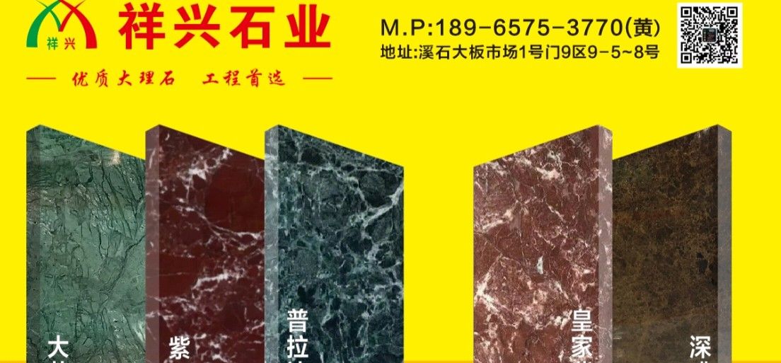 祥興石業(yè) 聯(lián)系人:黃小姐    189****3770 查看 189****3770 查看 主營范圍: 大板批發(fā)、荒料、 企業(yè)地址:福建泉州水頭福山工業(yè)區(qū)溪石1號門9區(qū)祥興石業(yè)