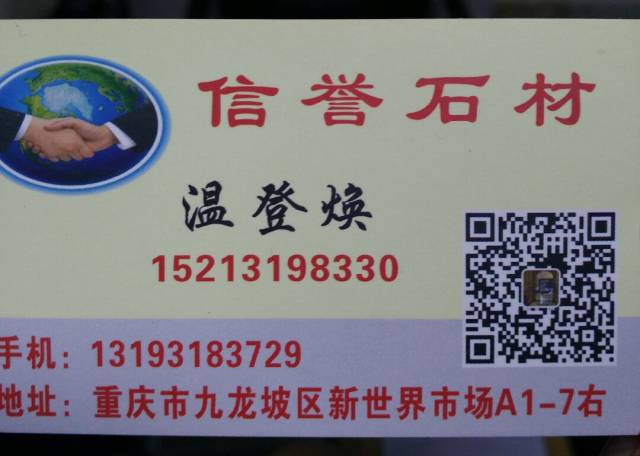 重慶信譽石材 聯(lián)系人:溫登煥    152****8330 查看 手機號碼:無 主營范圍: 大理石加工、異型加工、花崗巖加工、人造石加工、石材交易市場、 企業(yè)地址:重慶九龍坡區(qū)新世界建材市場A1-7