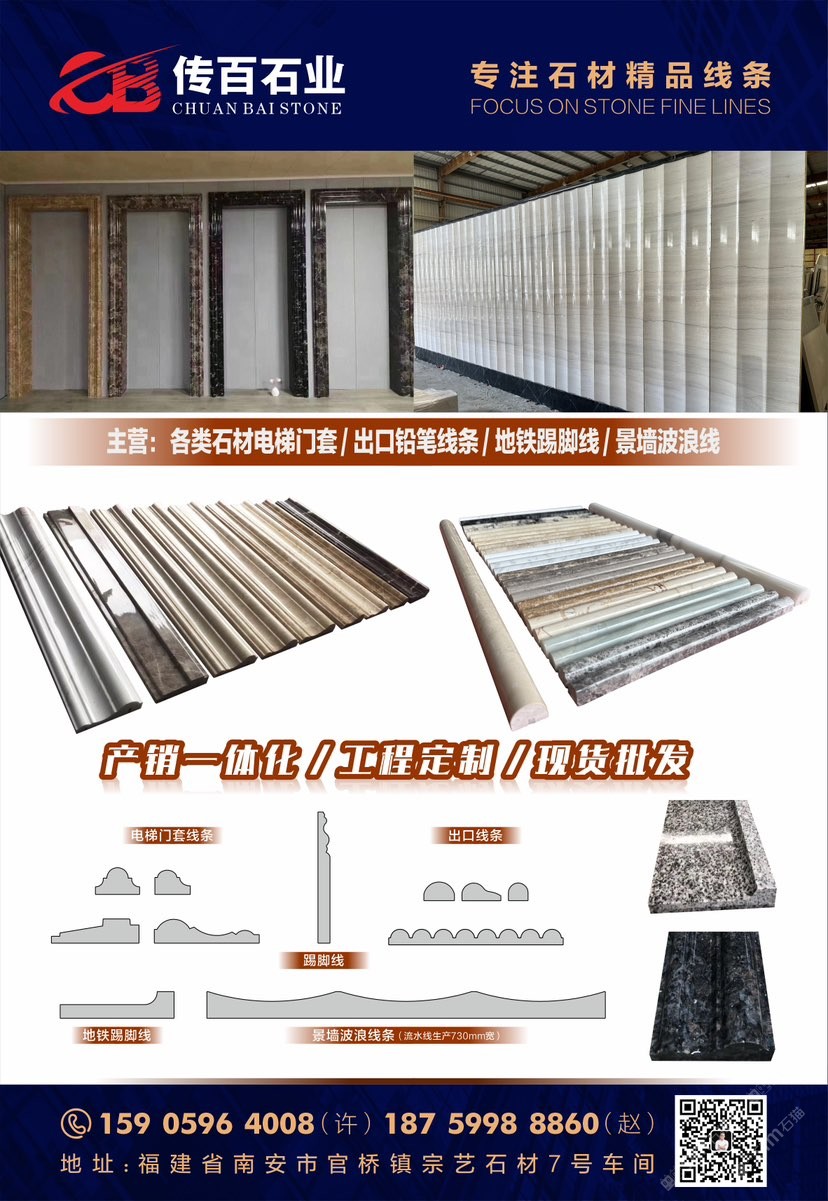 傳百石線|線條 聯(lián)系人:許    159****4008 查看 159****4008 查看 主營范圍: 異型加工、荒料、大理石加工、石材外貿(mào)、石材工程資質企業(yè)、礦山、花崗巖加工、大板批發(fā)、 企業(yè)地址:福建泉州南安市官橋鎮(zhèn)宗藝加工廠