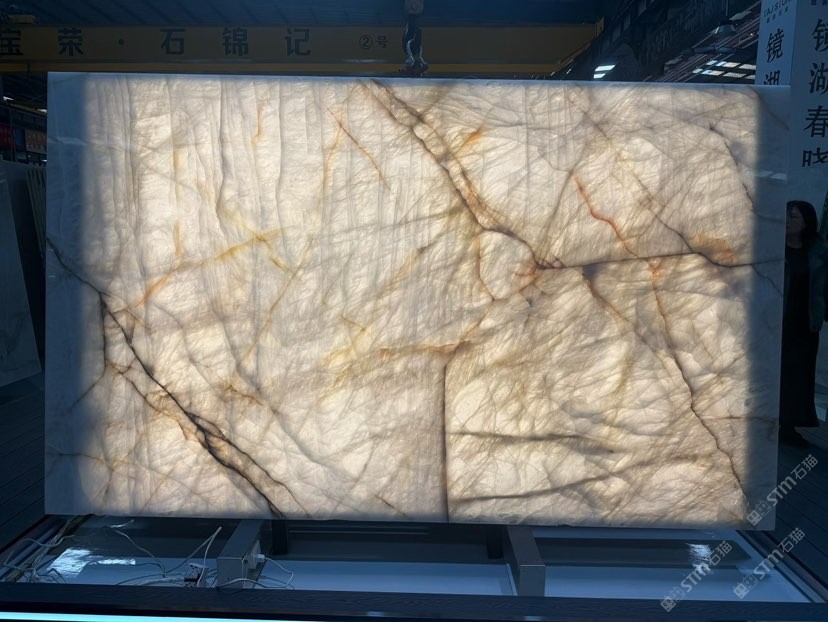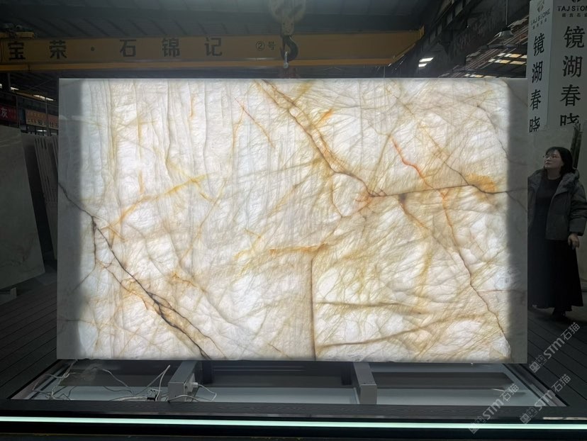 發(fā)布信息: 巴西白水晶 甄選巴西天然白水晶奢石,高純度石英結(jié)晶,造就透光肌理。金紋游走于瑩白底色,每一塊都是的自然孤品。適配高端大堂、透光背景墻與藝術(shù)隔斷,以石為幕,讓光線雕刻空間的奢華維度。 Brazilian White Crystal Quartzite Premium white crystal features high quartz content and exceptional translucency. Each slab boasts unique golden veining and flawless backlit performance. Ideal for high-end projects like backlit walls and countertops.