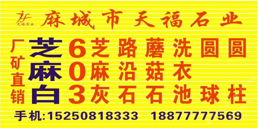發(fā)布信息: 天福石業(yè)【主營經(jīng)營】芝麻白(603#)、卡麥黃.602#.芝麻灰、銹石、黃金麻、卡拉麥里金·毛板、光板、火燒板,荔枝面成品板及臺(tái)階石、蘑菇石~路沿石、擋車石,圓球.圓柱.異形、仿形加工工藝品等。適合用于各種場合, 優(yōu)質(zhì)礦山資源以質(zhì)量求生存、以信譽(yù)求發(fā)展。聯(lián)系電話:15250818333