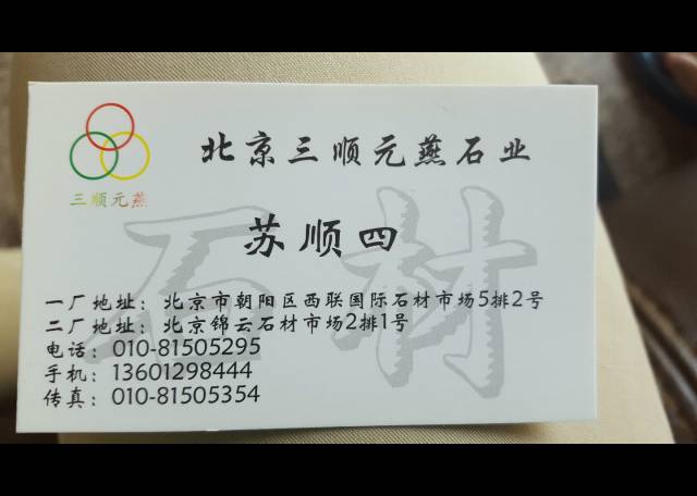 天津三順元燕石業(yè) 聯(lián)系人:蘇先生    136****8444 查看 手機號碼:無 主營范圍: 大板批發(fā)、荒料、異型加工、礦山、 企業(yè)地址:天津武清區(qū)武清區(qū)汊沽港天下石倉花崗巖市場4排25號