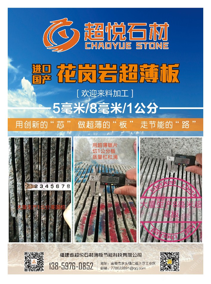 福建省超悅自在環(huán)保建材有限公司 聯(lián)系人:吳先生    138****0852 查看 138****0852 查看 主營范圍: 荒料、花崗巖加工、礦山、薄板復合板加工、 企業(yè)地址:福建南安南安市石井鎮(zhèn)濱海工業(yè)區(qū)支五路408號