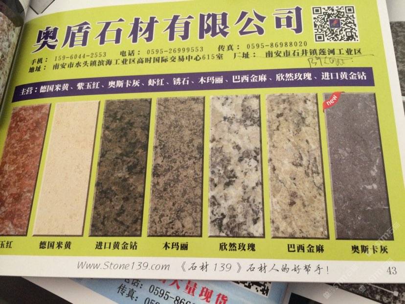 奧盾(福蘭慈)石材有限公司 聯系人:徐先生    159****2553 查看 0595-****9553 查看 主營范圍: 礦山、荒料、花崗巖加工、大板批發(fā)、 企業(yè)地址:福建南安水頭鎮(zhèn)濱海工業(yè)區(qū)高時物流辦公室411室